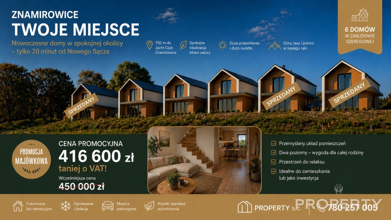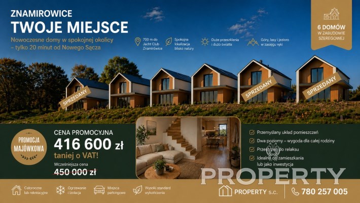 Na sprzedaż nowoczesne, całoroczne domy w Znamirowicach w stanie deweloperskim, położone ok. 200 m od Jeziora Rożnowskiego i 700 m od Yacht Clubu PTTK „Beskid”. Lokalizacja łączy ciszę i otoczenie natury z możliwością aktywnego wypoczynku – w pobliżu przystań żeglarska, trasy spacerowe i rowerowe oraz tereny rekreacyjne nad jeziorem.